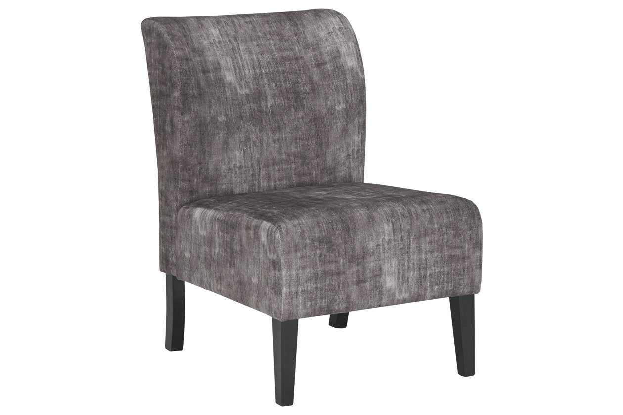 Fashion-forward Triptis accent chair adds a cool vibe to your home. Armless design is perfect for small spaces that need a spark of color. Charcoal gray hue with distressed finish saturates the ultra soft fabric. Supportive cushions bring in an element of comfort.