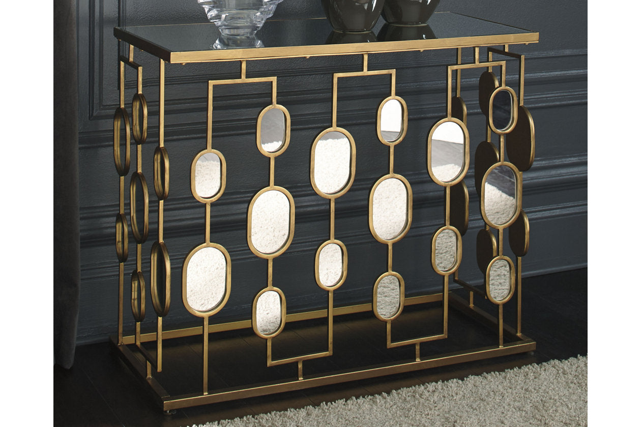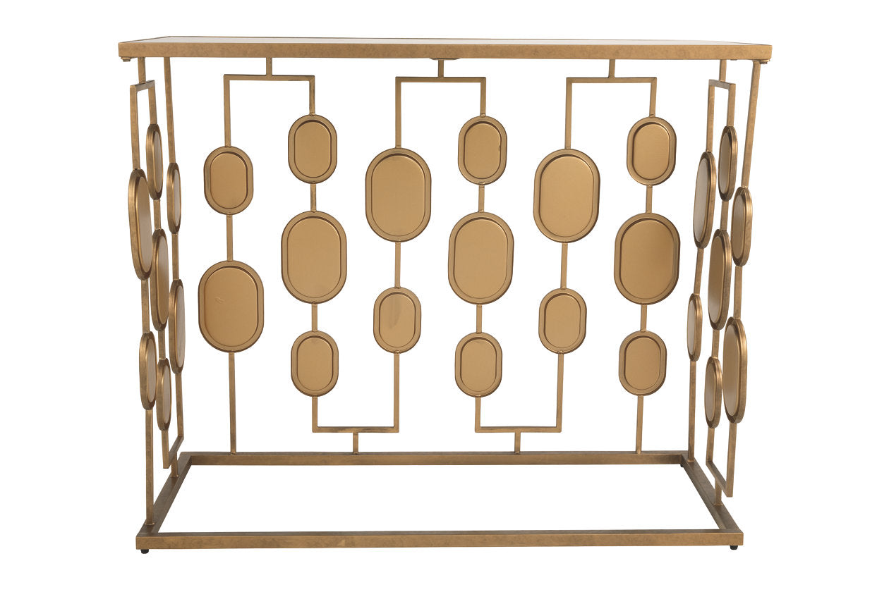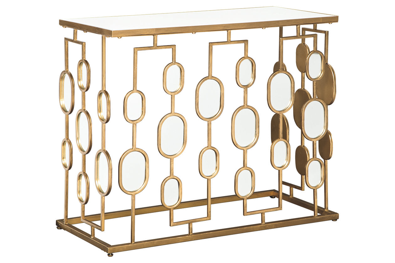 Let your sense of high design shine with the Majaci console table. Mirrored glass and a luminous goldtone finish make luxury a part of everyday living. Minimalist-chic styling is sure to open up a space beautifully.