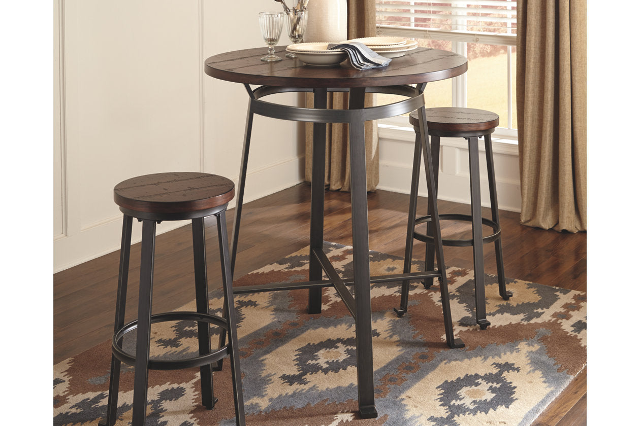 Rustic in feel with modern appeal, the Challiman dining room pub table is styled with fascinating flair. Veneered plank table surface serves up cool distressed character. Sculptural legs punctuated by L-shape feet form the industrial-inspired base.