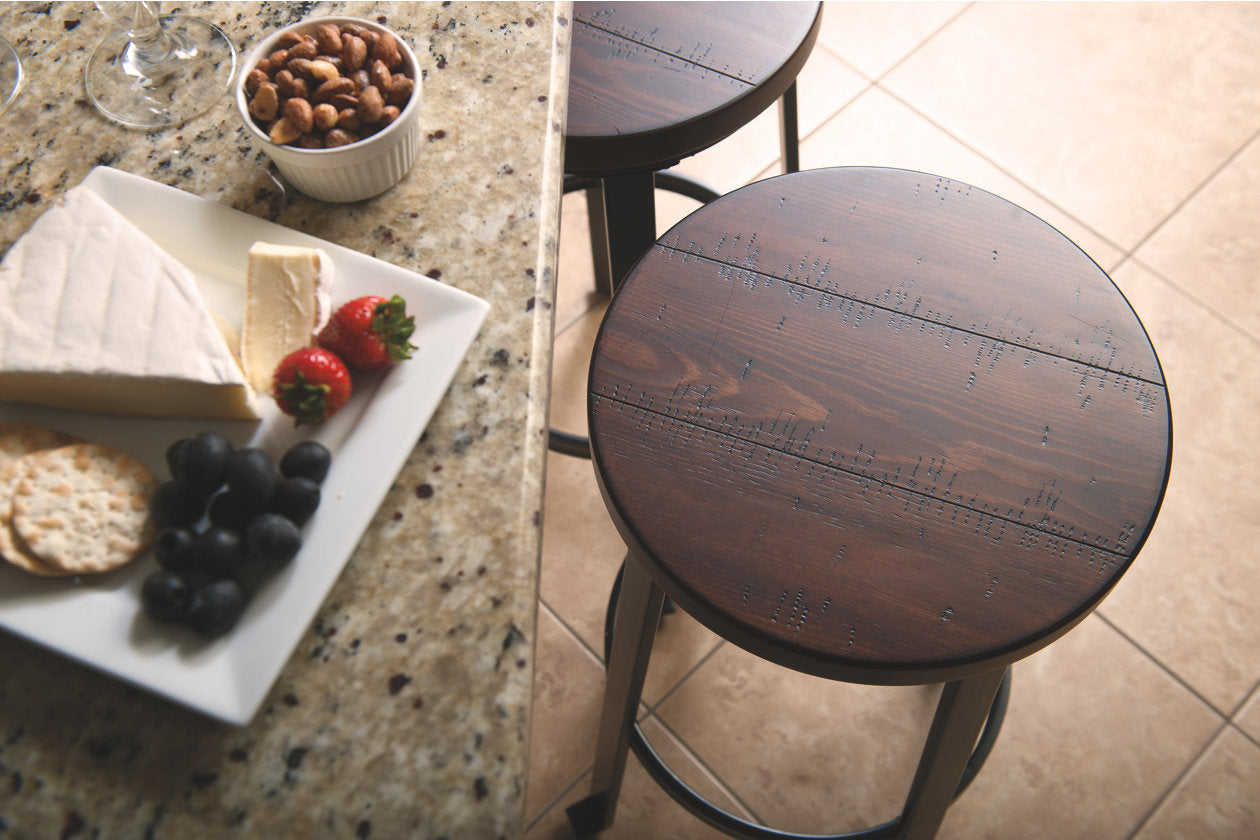 Rustic in feel with modern appeal, the Challiman counter height bar stool is styled with fascinating flair. Veneered plank table surface serves up cool distressed character. Sculptural legs punctuated by L-shape feet form the industrial-inspired base.