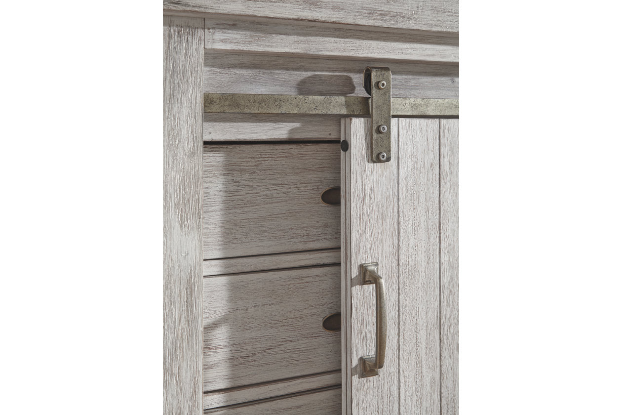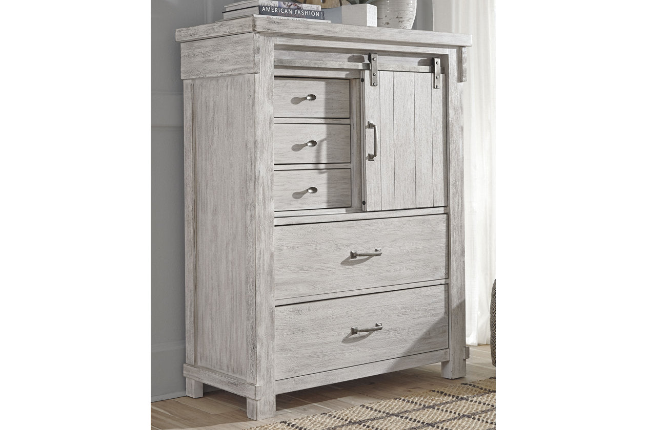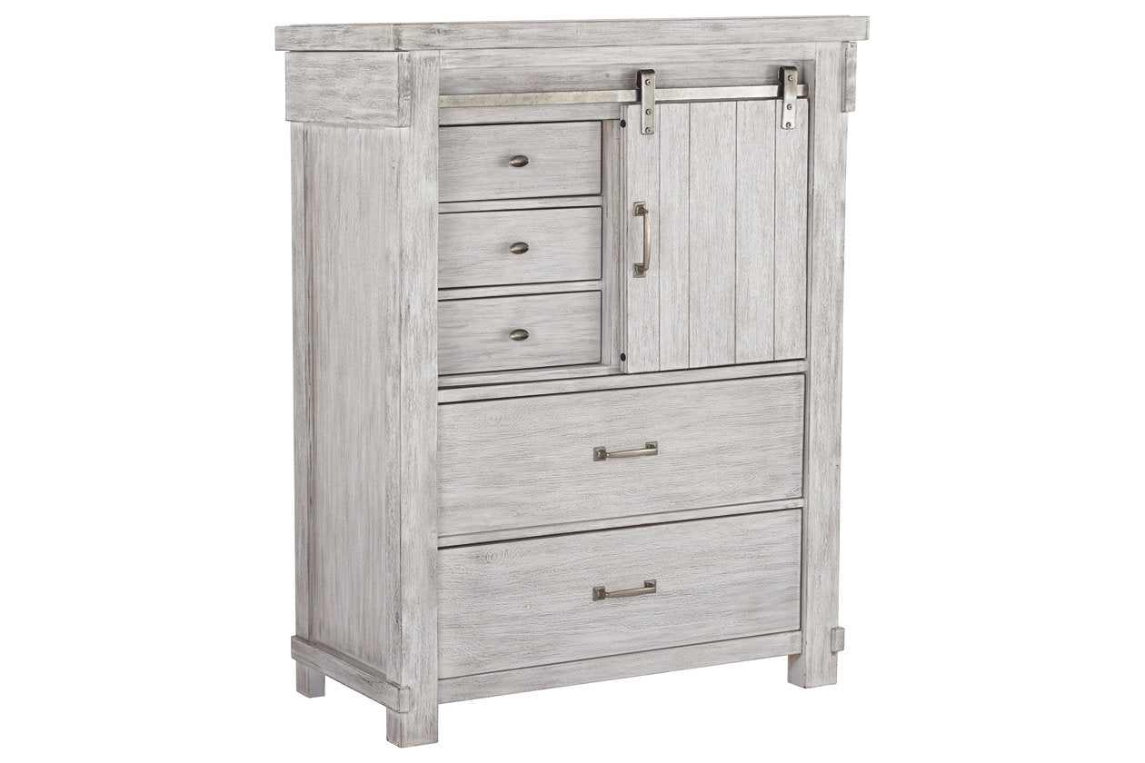 The Brashland chest of drawers brings a fresh twist to the modern farmhouse movement. Handsome, hearty profile is made all the more interesting with a sliding “barn door” revealing shelved storage. Through-tenon styling incorporates a welcome touch of American craftsman. And the easy on the eyes, distressed white finish? Just the tone for a soothing, serene bedroom retreat.