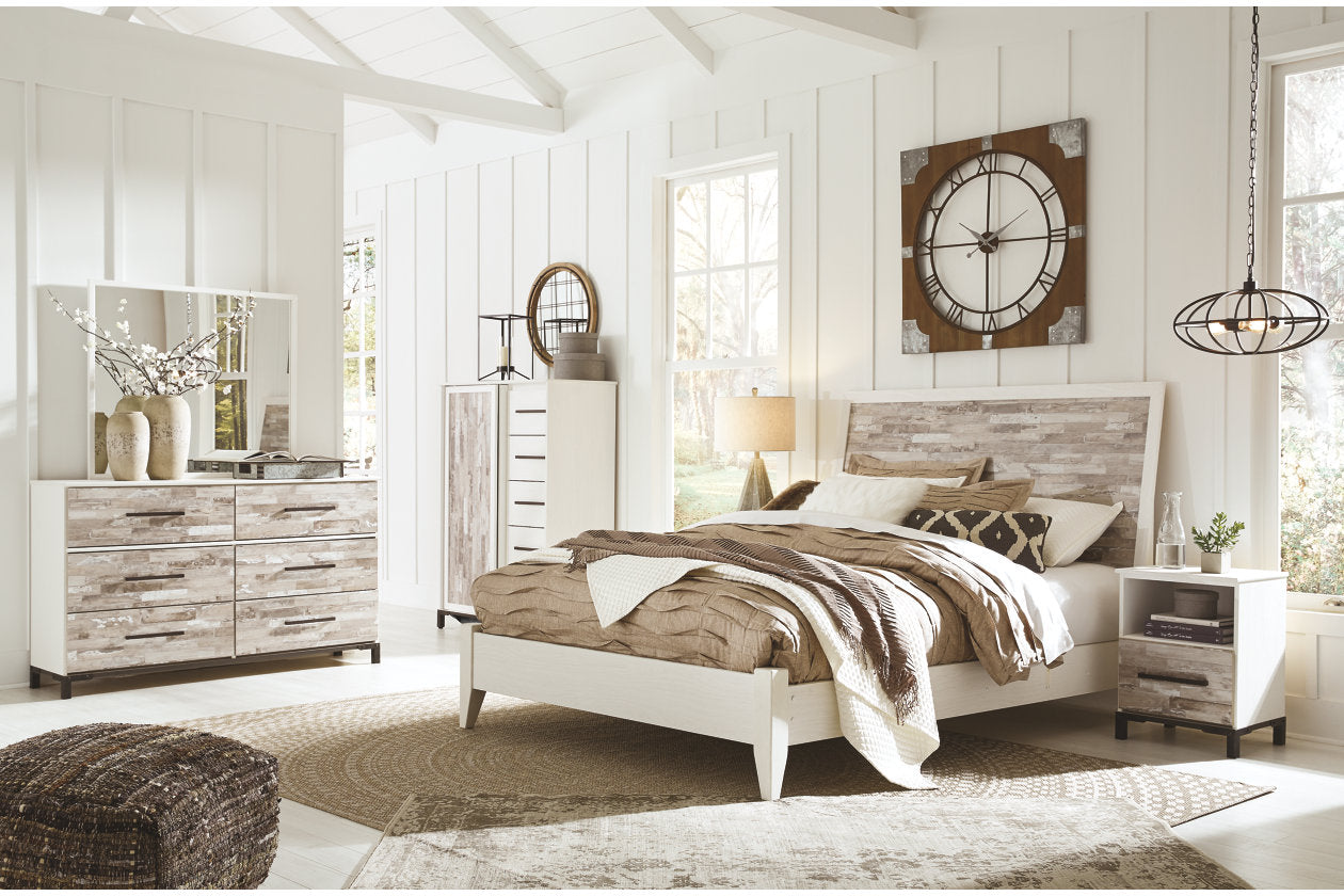How does this sound? An urban sleek aesthetic with a touch of the great outdoors. That’s the beauty of the refreshingly different Evanni dressing chest. A vintage white finish is blended with replicated gray wood grain with butcher block design for a dual serving of style. Offering twice the storage potential, the chest includes a sliding door revealing three adjustable shelves alongside five smooth-gliding drawers. Long, linear drawer pulls in a gunmetal finish are cool and eye-catching.