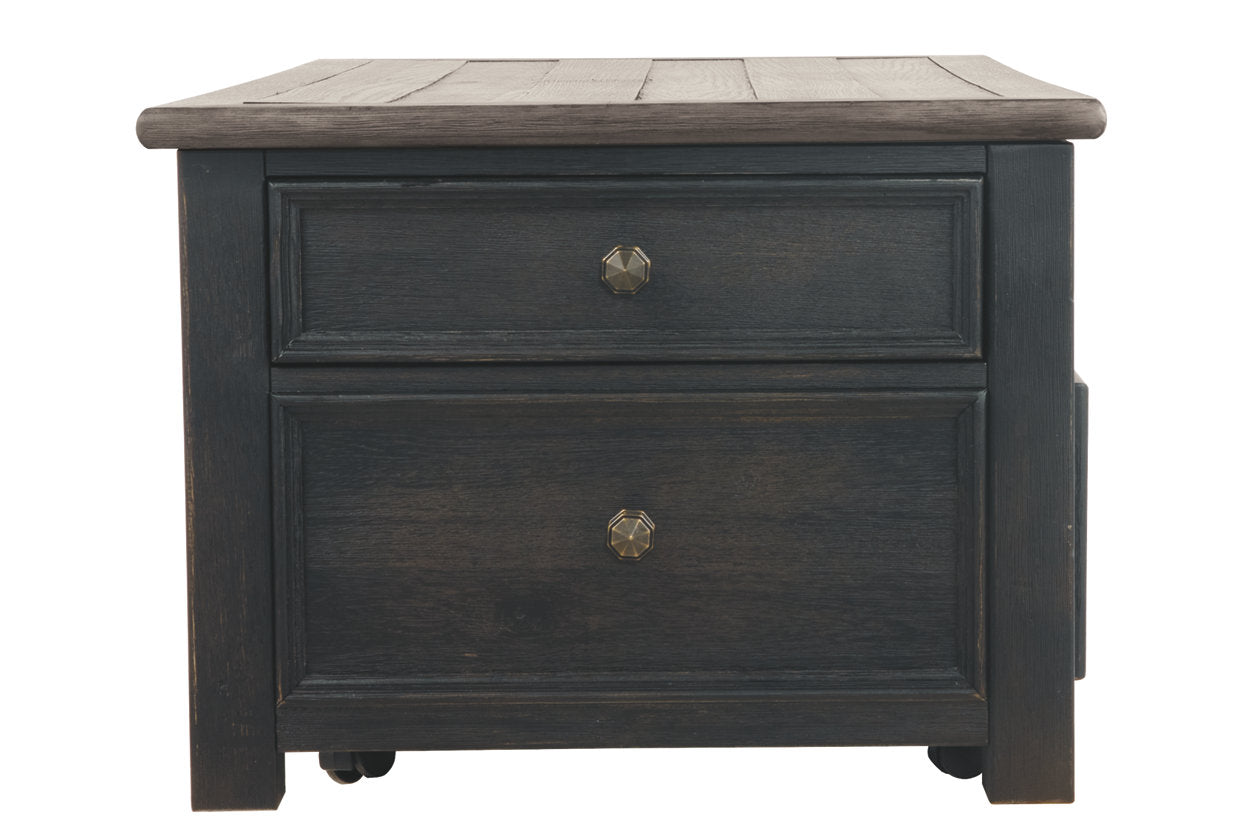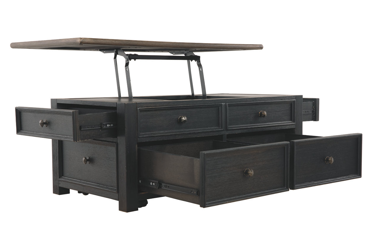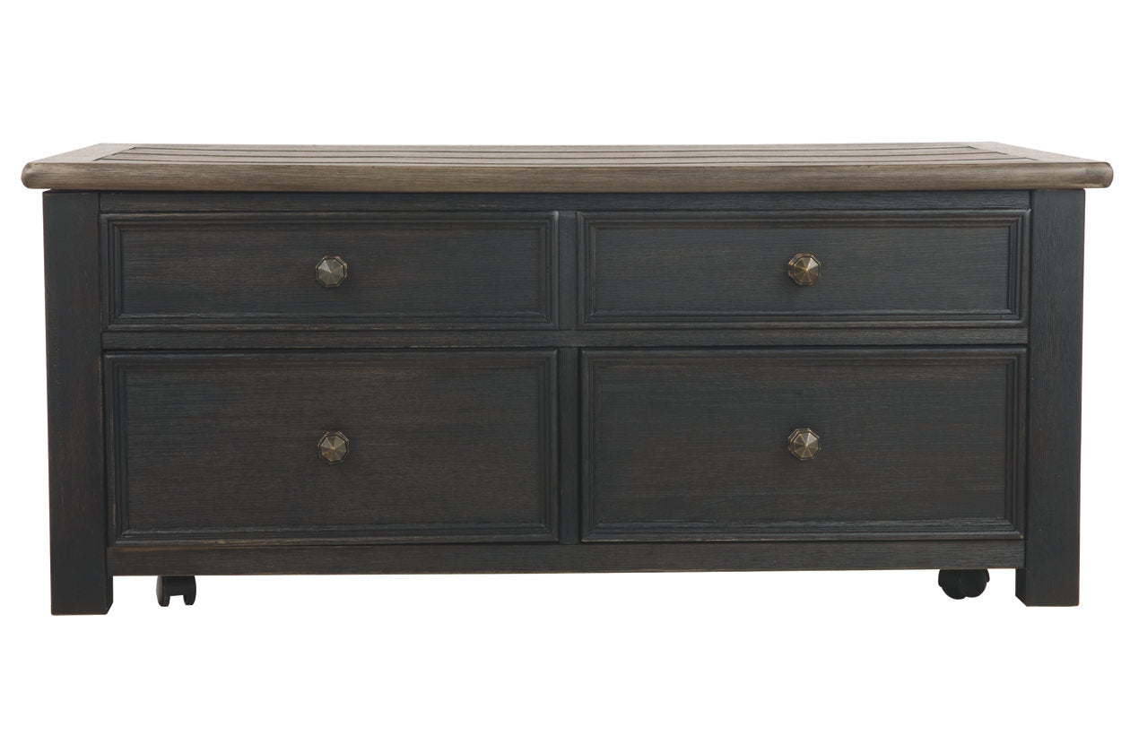 Shabby chic with a hint of down home country. The Tyler Creek lift-top coffee table with textured black finish is all the talk of today’s design world. Wood grain shows through the weathered gray-brown top in all of its earthy pleasure. Framed drawers are adorned with lovely traditional hardware. Smooth pull-out makes it easy for you to store away your belongings in style. Lift-top transforms your space into a workstation without a hitch.