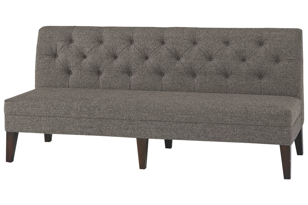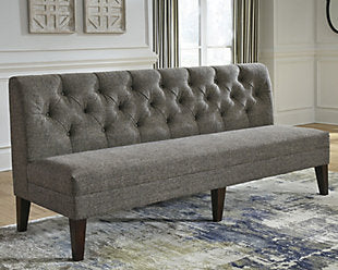 Stretch the possibilities of dining room seating with the Tripton extra large upholstered dining room bench. Button-tufted linen-weave upholstery in a rich neutral sets the tone for everyday luxury and sophistication. Generous scale makes room for one and all.