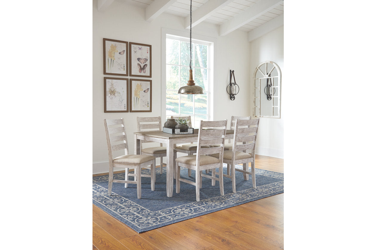 Set the scene for coastal chic or modern farmhouse living with the Skempton dining room table set. Clean-lined, simply striking table doubles the charm with a brown tone top with plank effect, paired with a grayish white base with rub through effect for timeworn appeal. Six chairs with classic ladderback styling and comfortably upholstered seats make room for one and all.