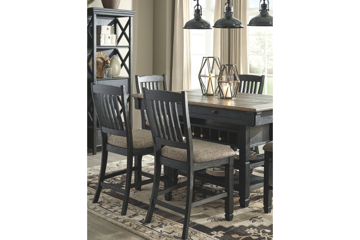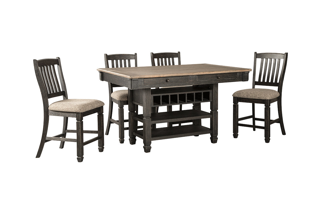 Set your sights on the counter-height Tyler Creek dining table set. This high-profile table beautifully suits your storage needs—base includes two open shelves, four drawers and a built-in wine rack. Heavily textured black and oak finish is trend-right urban farmhouse style. Set includes four upholstered bar stools with tapered legs for a winning combination.