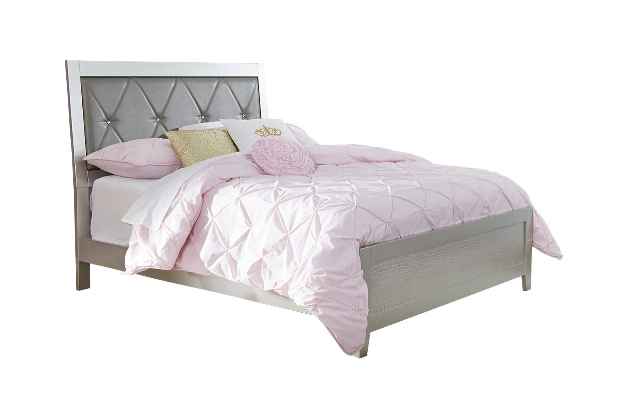 Made with paint grade materials and hardwood solids finished with a metallic silver color. Embossed textural drawer fronts and footboard panel have a modern "Glam" look. Headboard panel features diamond tufted gray faux leather cover with crystal look buttons. Metal center guide drawers with paper wrapped boxes. Bar pulls with inset faux crystal arrangement. Mirror has decorative upholstered insert with gray faux leather cover. Twin and full panel bed is made with paint grade materials and hardwood solids finished with a metallic silver color. Footboard has embossed textural panel within a simple frame and tapered leg. Headboard panel features diamond tufted gray faux leather cover with crystal look buttons. Fully upholstered bed is offered in twin and full sizes and has box stitching and shallow tufting effect with crystal look buttons and delivers in one box.