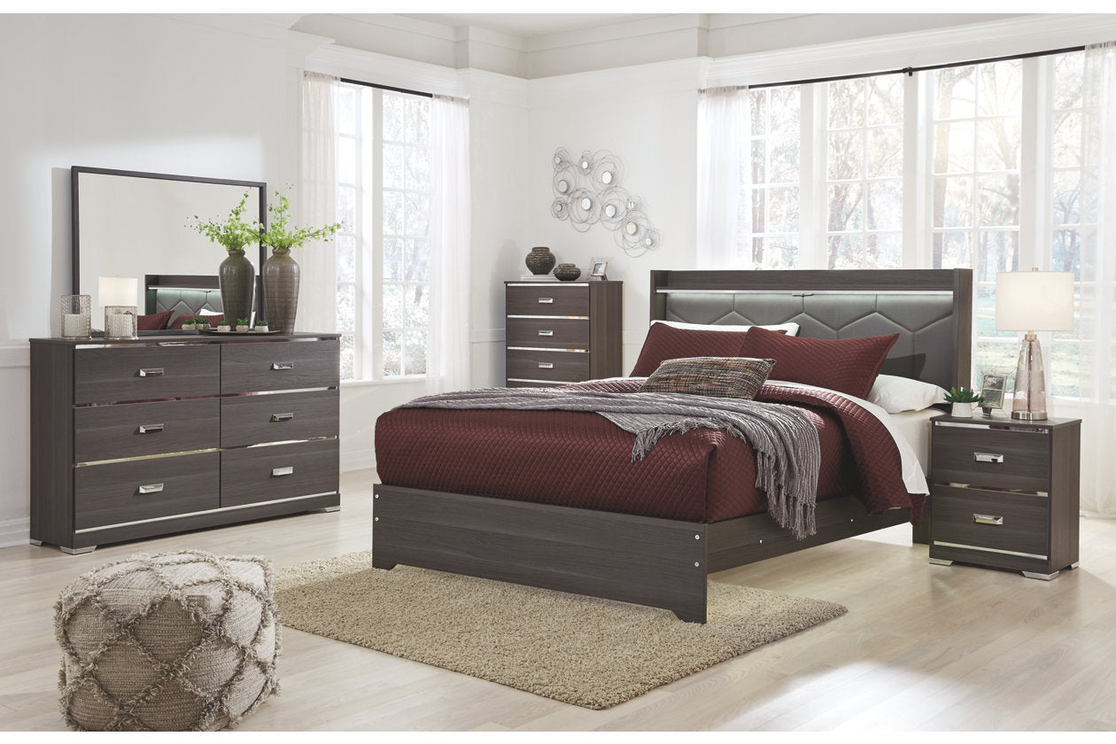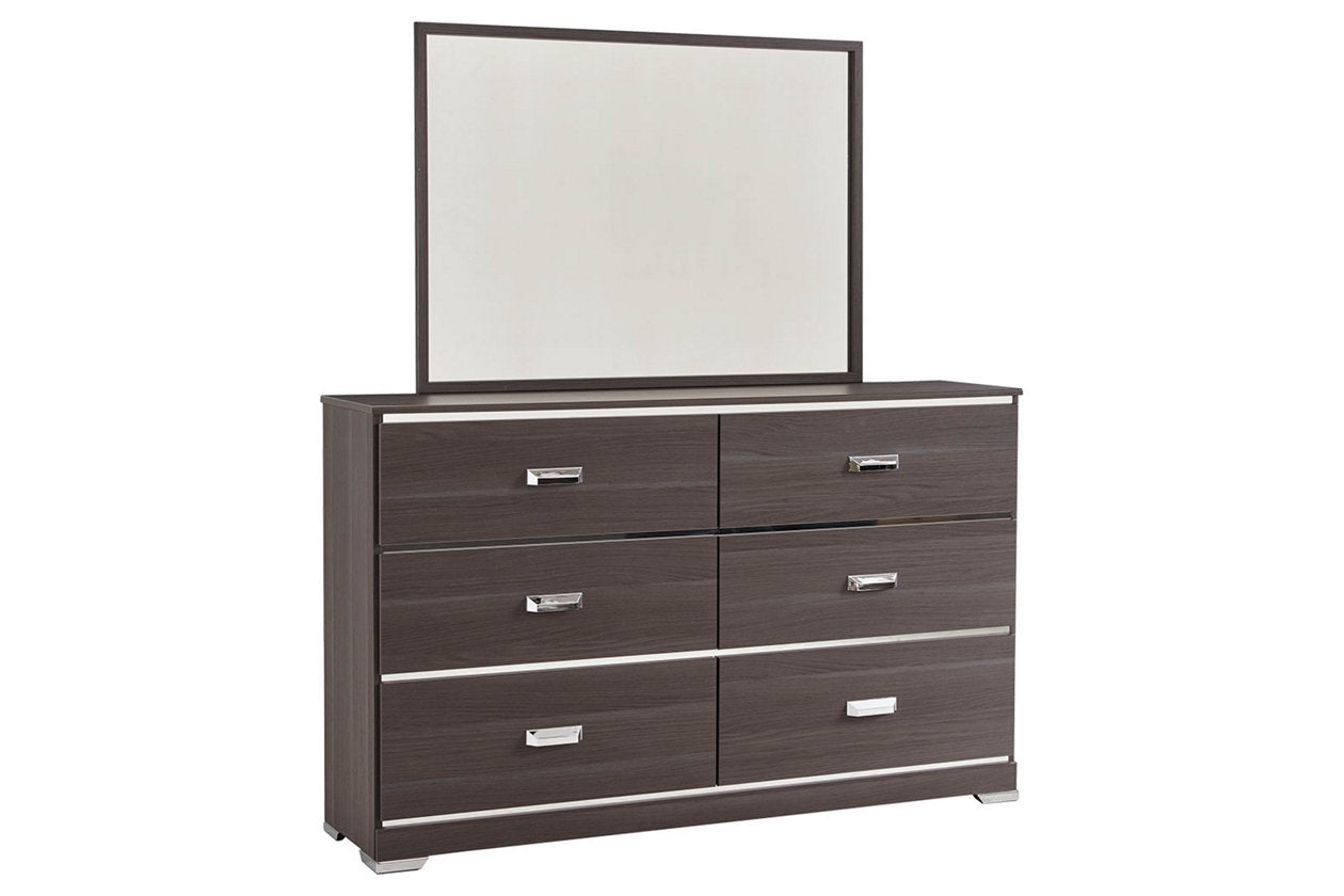 Slender and streamlined, the Annikus dresser and mirror set shows off less-is-more sensibility in the most stylish of ways. Shiny chrome accents are totally modern and highlight the authentically designed wood grain finish. The subtle sheen of timeworn gray softens the piece, for a look that perfectly showcases their cool sense of style. What a showstopper.