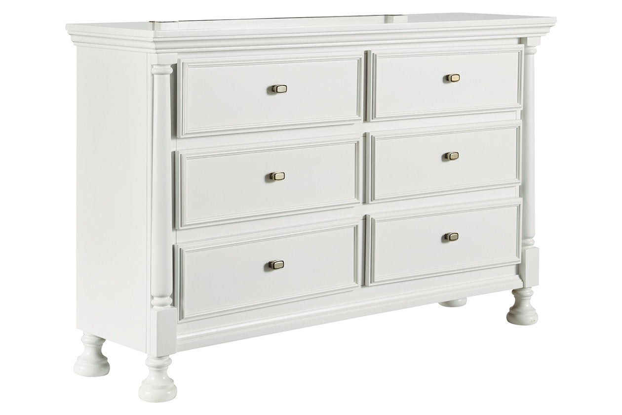 Let your country cottage style shine through with the crisp and cheerful Kaslyn dresser. Clean lines are enhanced with refined details such as classic half-round pilasters and beautifully turned bun feet. Six smooth-gliding drawers easily accommodate your wardrobe needs.