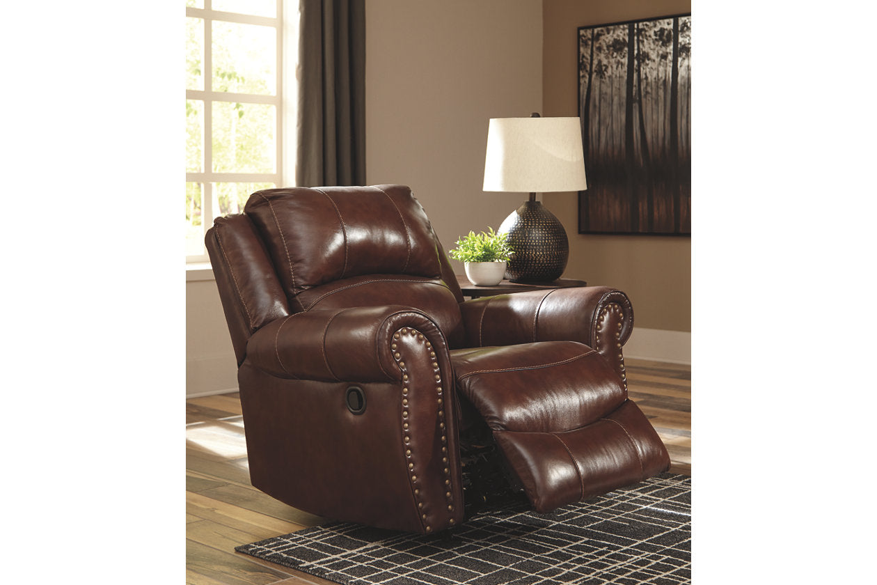 Merging the handsome, stately looks of an armchair with kickback comfort from head to toe, the Bingen rocker recliner rocks on so many levels. Rest assured, this recliner’s seating area is wrapped in top-grain leather for your pleasure. Skillfully matched upholstery everywhere keeps the price well within reason. The recliner’s roll arm profile punctuated with oversized nailhead trim is an easy complement for contemporary and classic decor.