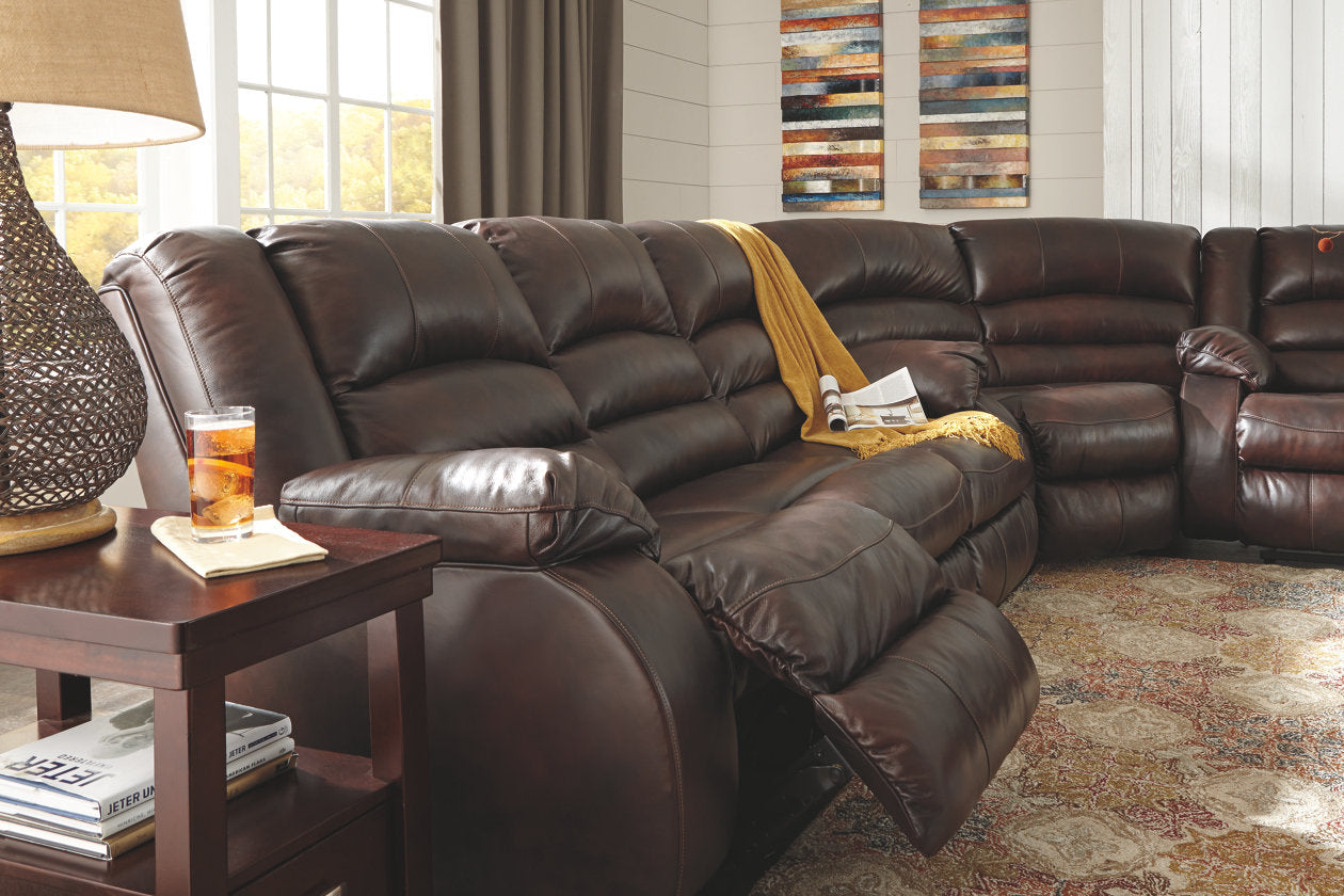 Bring home ultimate comfort with the Levelland 3-piece reclining sectional. Recline back in infinite positions of relaxation. Padded cushions on waterfall back design and pillow top arms offer plenty of support. Top it all off with 100% leather in the deep seating area and a two-tone warm brown color effect.