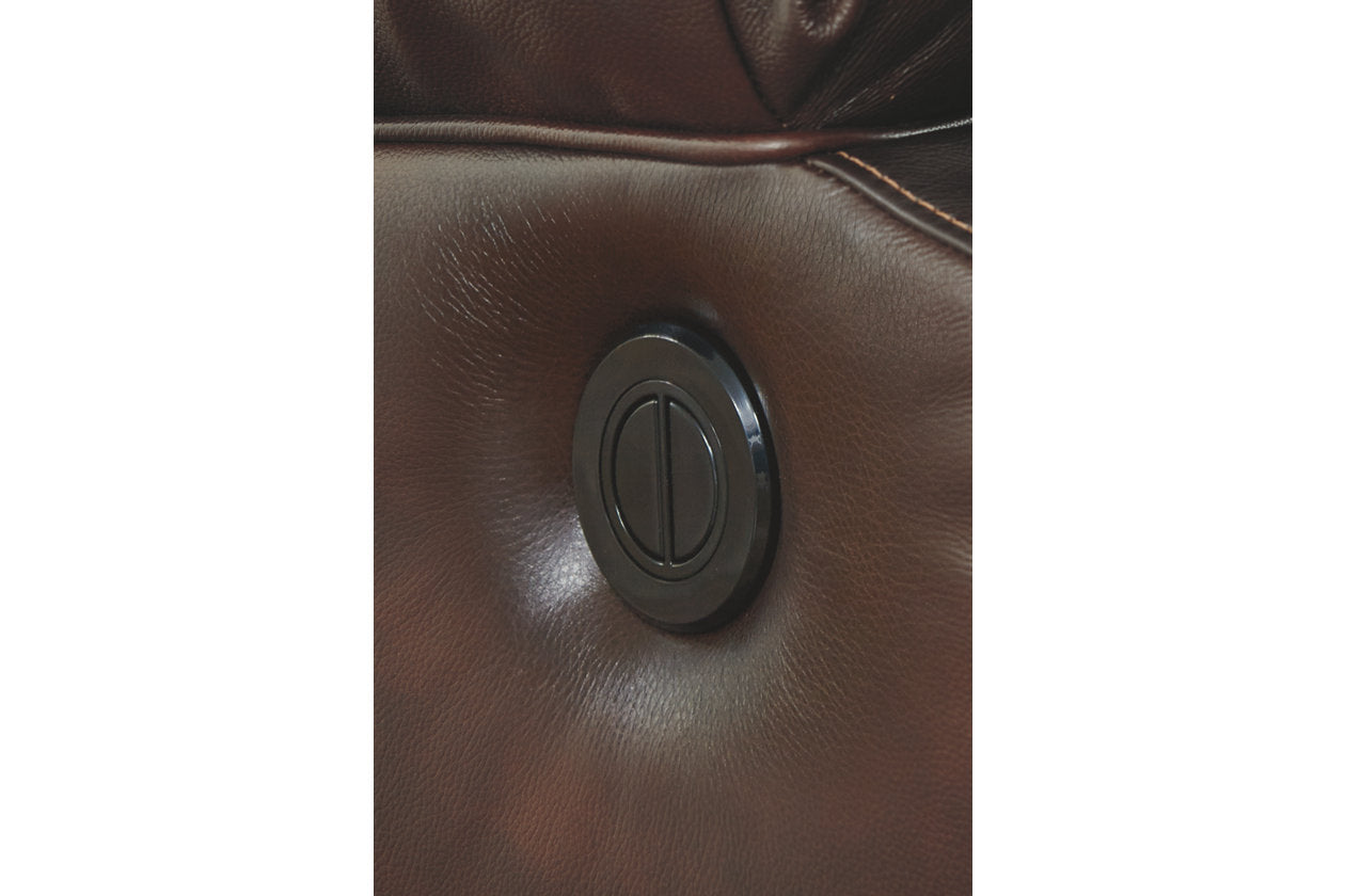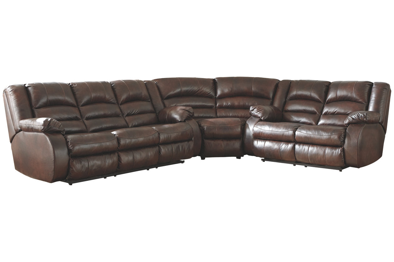 Bring home ultimate comfort with the Levelland 3-piece power reclining sectional. Recline back in infinite positions of relaxation at one easy push of a button. Padded cushions on waterfall back design and pillow top arms offer plenty of support. Top it all off with 100% leather in the deep seating area and a two-tone warm brown color effect.