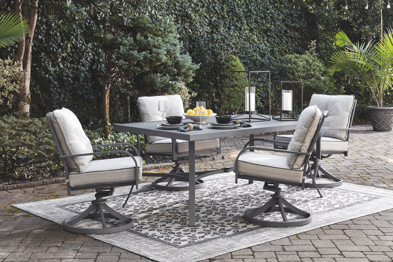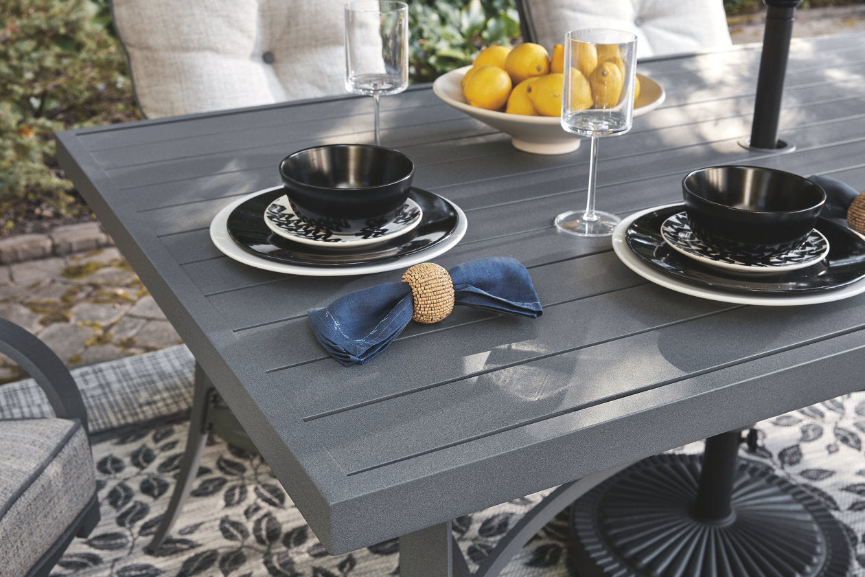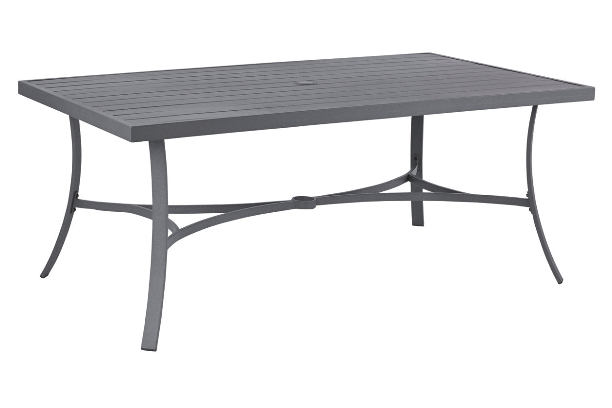 The Donnalee Bay outdoor dining table with umbrella hole serves it up right with a trendy, textural gray finish that’s decidedly modern. Sturdy, rust-proof aluminum is sure to weather the seasons beautifully. Crafted for rainwater runoff, the slat-style top is as pretty as it is practical.