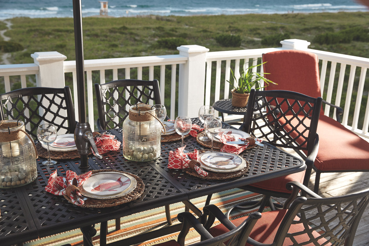 Elegant and inviting, the Tanglevale rectangular extension dining table reinvents how you savor al fresco meals. The visually pleasing lattice tabletop is cast in all-weather aluminum and powdercoated for seasons of enjoyment. Two built-in leaves transform the table into seating for eight—chairs sold separately.