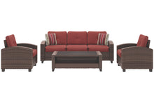 - Includes 4 pieces: sofa with cushions and pillows, 2 lounge chairs with cushions and coffee table