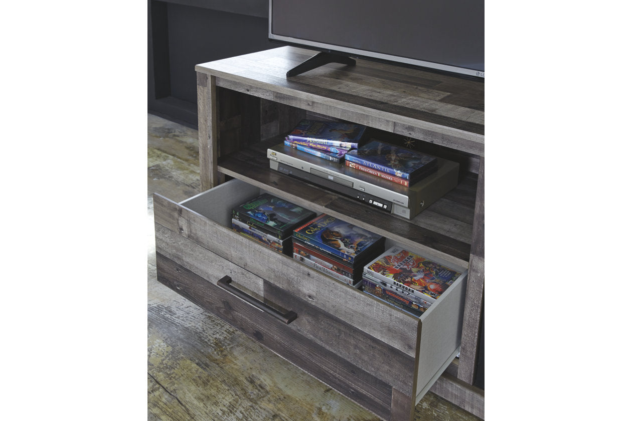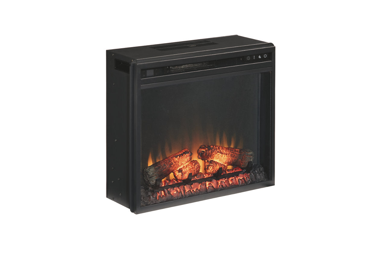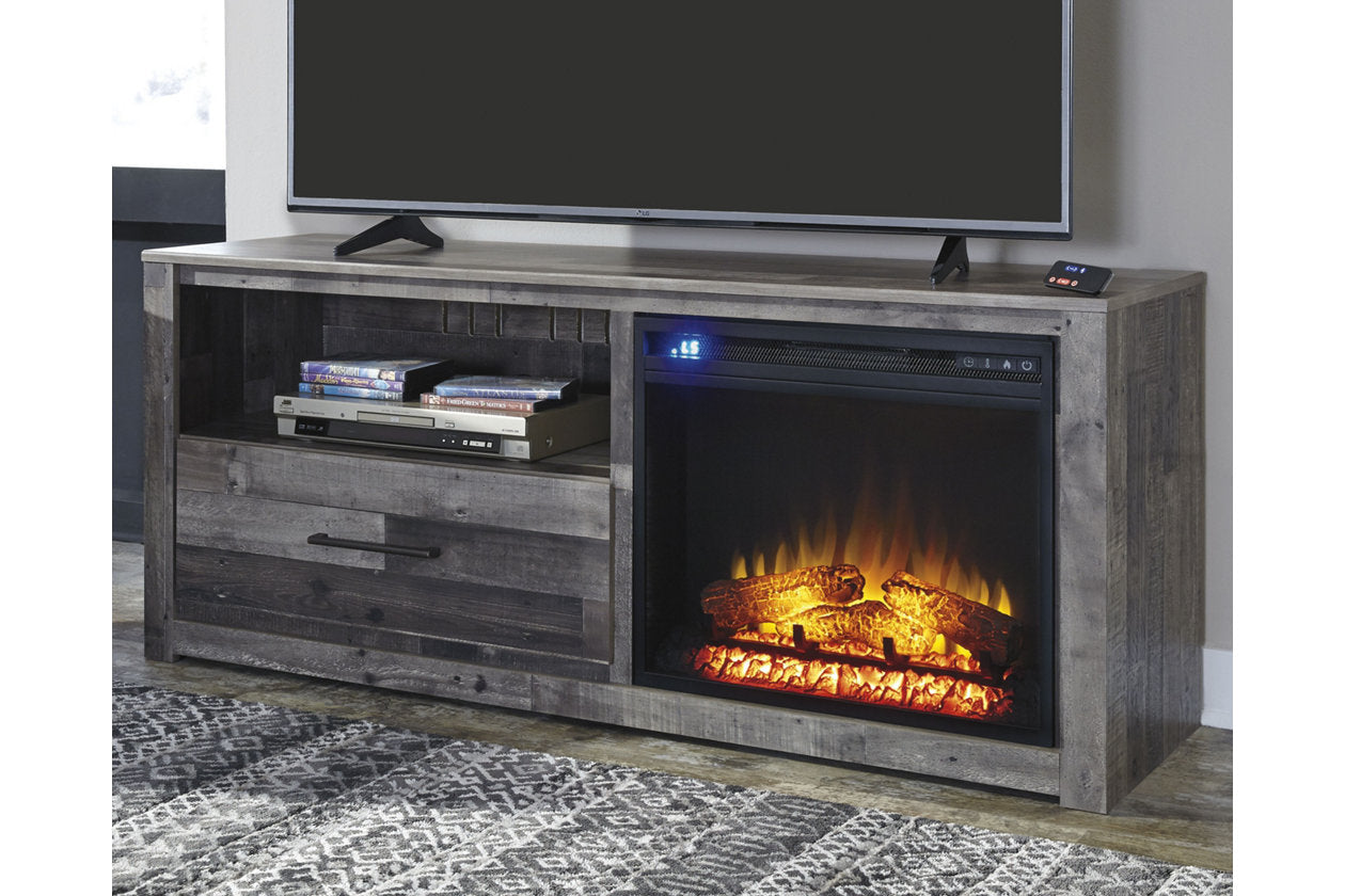 The Derekson TV stand with fireplace insert is sure to take center stage with urban eclectic style. Its rustic finish over a replicated pine grain creates an authentic look for your home entertainment area. You'll love its functionality. A spacious drawer, open cubby and adjustable shelf easily accommodate media needs. Cutouts keep wires out of sight and provide ventilation. Bringing a touch of romance to the scene with realistic logs and glowing embers, the provided LED fireplace operates with or without heat and includes a six-level temperature setting, remote control and overheating control for added safety. The fireplace insert fits seamlessly once you remove the adjustable shelf and back panel on the right.