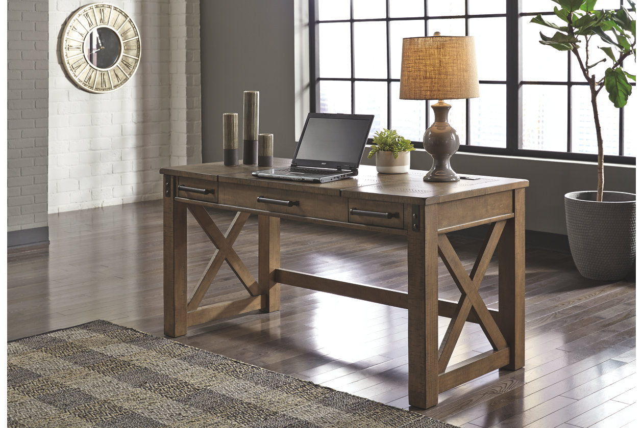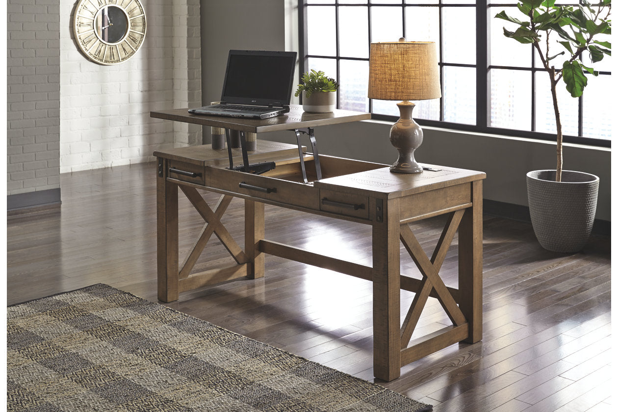 Crafted with pine veneers and wood treated to a distressed gray finish, the Aldwin lift top desk is rustic farmhouse living at its best. Crossbuck styling adds striking flair, while metal industrial brackets incorporate an industrial twist. Elevating the functionality of this lift top desk all the more: two smooth-gliding drawers and conveniently placed AC power/USB plug-ins.