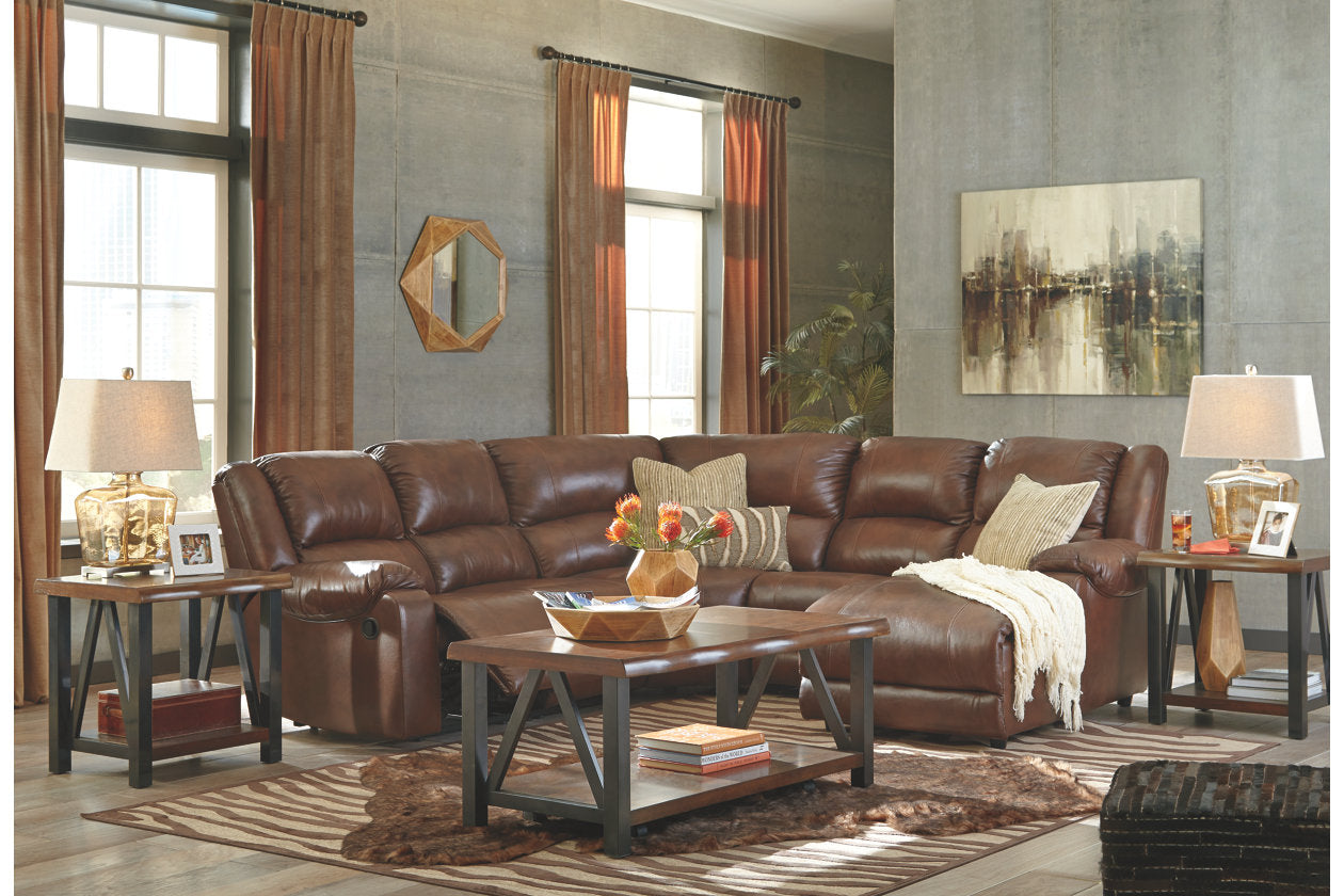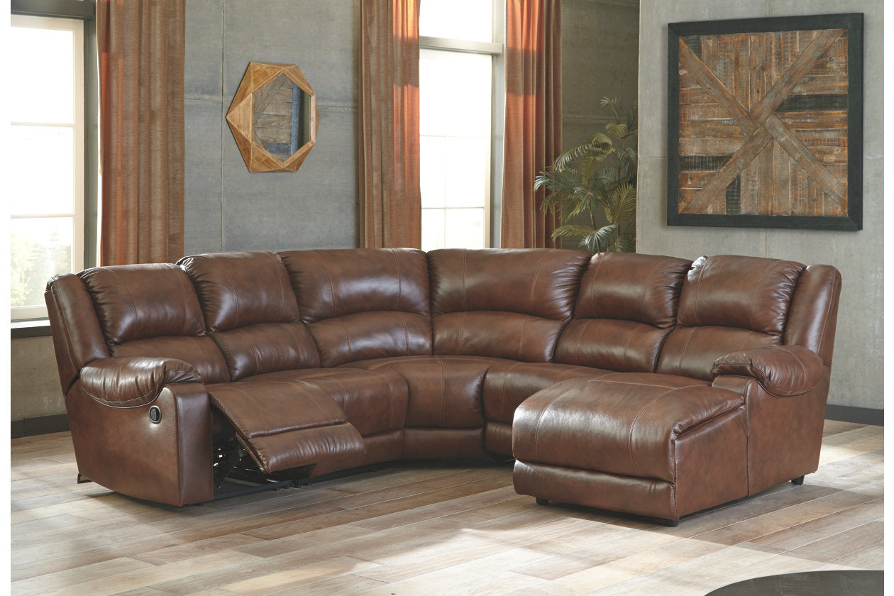 By blending ruggedly handsome good looks, designer styling and plush comfort, the Billwedge 5-piece sectional fits the bill in a beautiful way. Rest assured, the entire seating area is wrapped head to toe in indulgently soft real leather with a pebbly texture and rich tonal variation. Elements including a zero wall recliner make it more space efficient, allowing you to kick back and really make yourself at home.