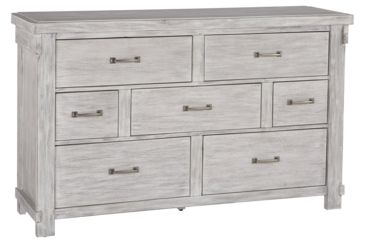 The Brashland dresser brings a fresh twist to the modern farmhouse movement. Handsome, hearty profile is made all the more interesting with a staggered drawer layout. Through-tenon styling incorporates a welcome touch of American craftsman. And the easy on the eyes, distressed white finish? Just the tone for a soothing, serene bedroom retreat.