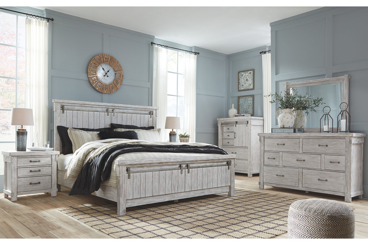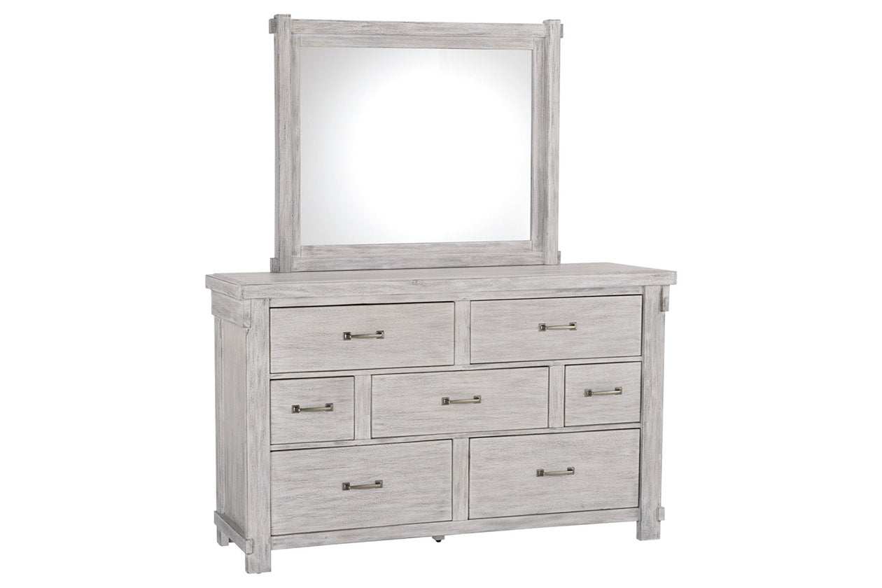 The Brashland dresser and mirror set brings a fresh twist to the modern farmhouse movement. Handsome, hearty profile is made all the more interesting with a staggered drawer layout. Through-tenon styling incorporates a welcome touch of American craftsman style. And the easy on the eyes, distressed white finish? Just the tone for a soothing, serene bedroom retreat.
