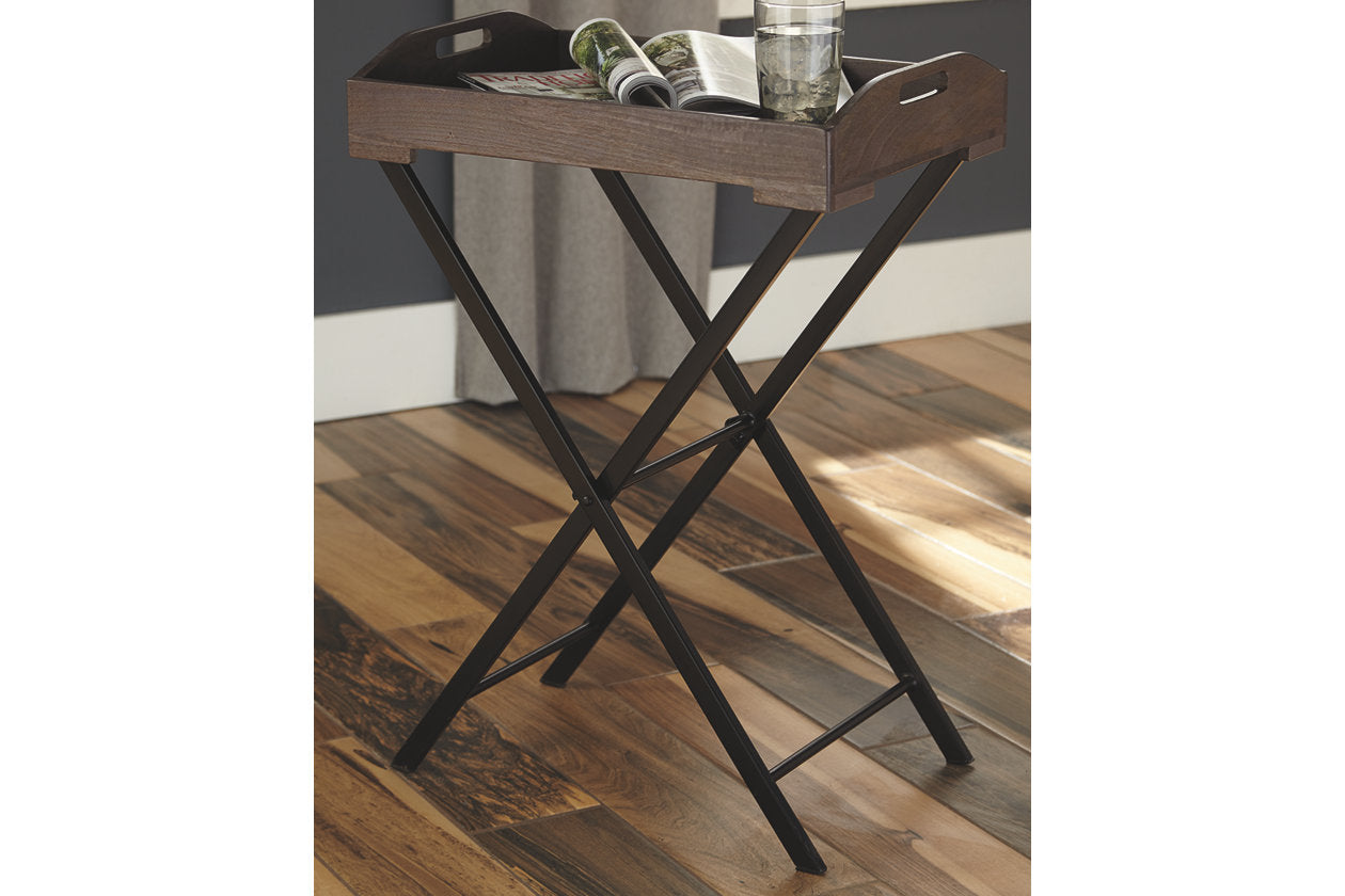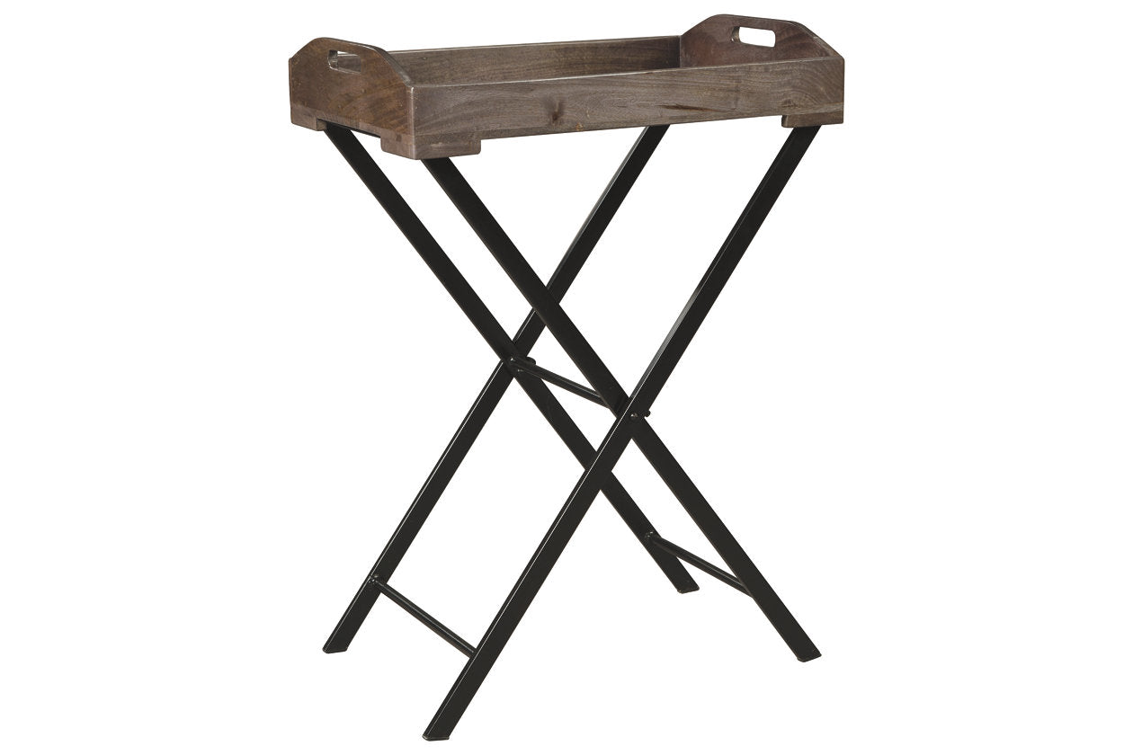Bring your food to you with the modern farmhouse Cadocridge accent table. Removable wooden tray holds your food and beverages wherever you are. Antique gray finish of the wood embraces the beauty of natural elements. You’ll love the ease of folding the black finished metal base to put away when you’re done.