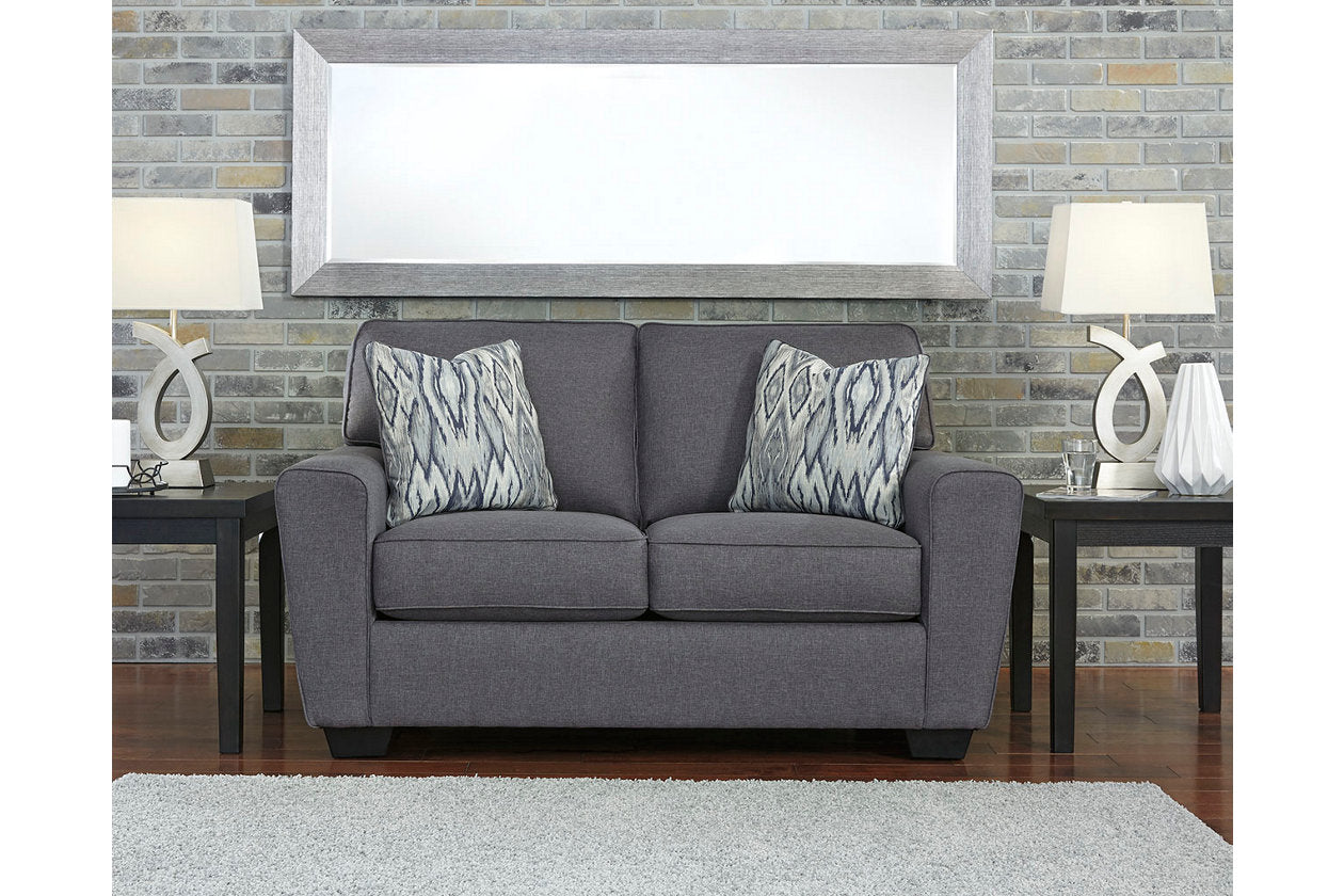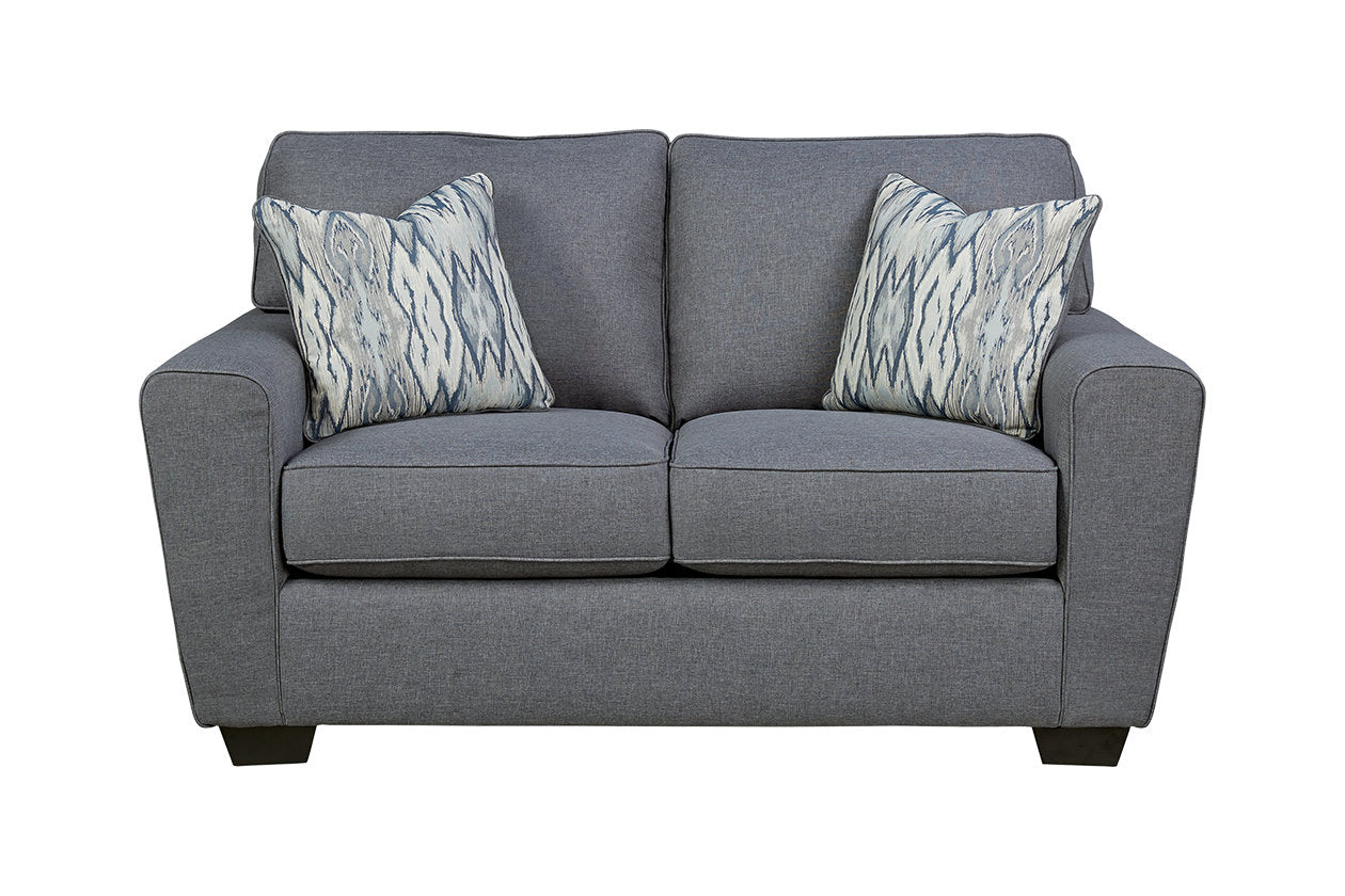 In the chicest shade of gray, Calion loveseat’s linen-weave upholstery complements so many color schemes and aesthetics. Flared arms, prominent welting and flamestitch-print pillows add just enough panache to this sweet and simple loveseat. Supportive seat cushions and extra-wide arms make for one comfortable landing pad.