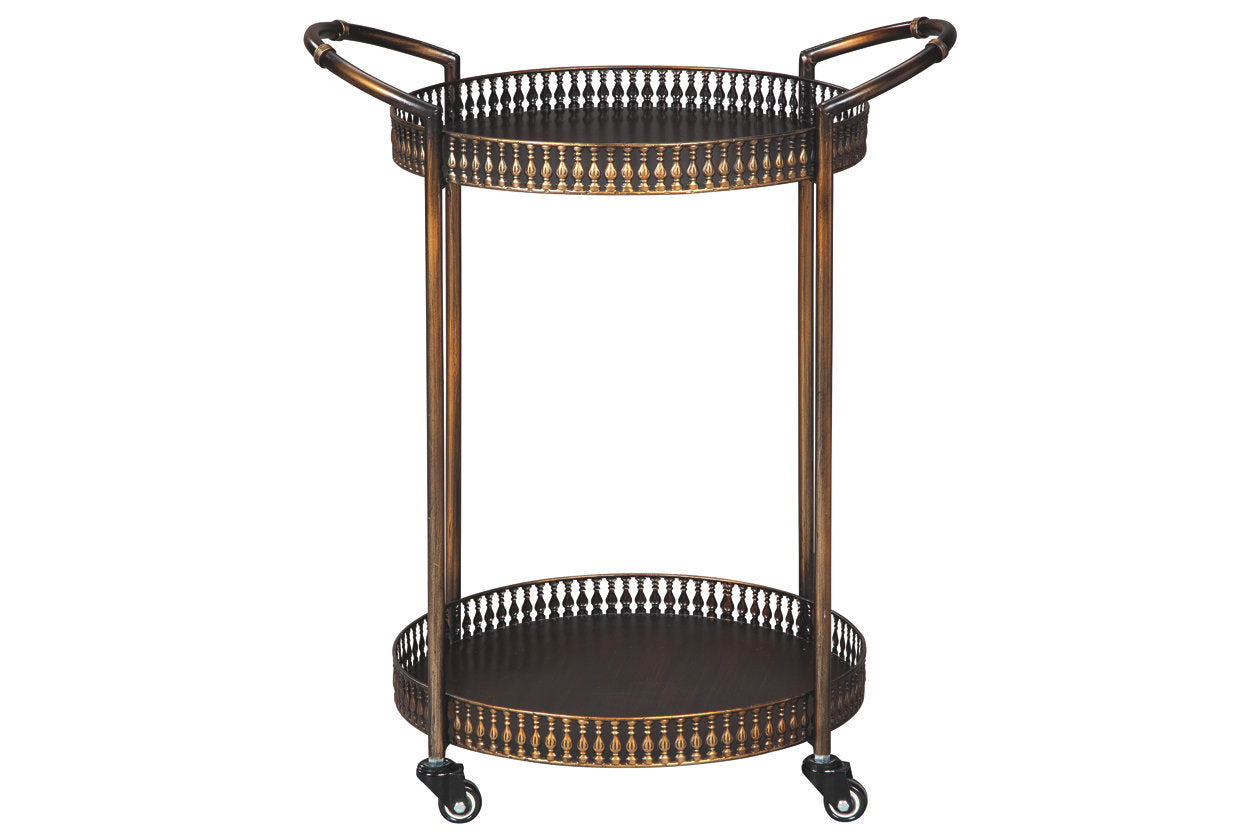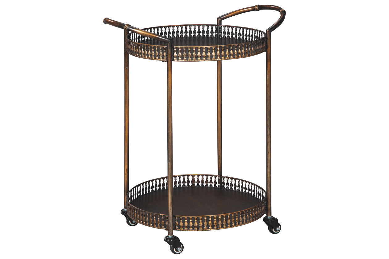 Whisk away your worries with the Clarkburn bar cart, which has plenty of room for spirits, glassware, and other bar essentials. Curved metal handles and caster wheels make for easy maneuverability, while the bronze-tone finish adds a hint of refinery in any room. What a showstopper piece that charms with a “less is more” aesthetic.