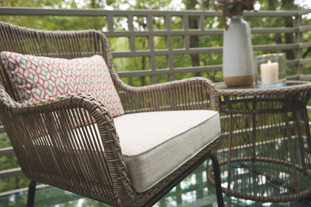 Add boho chic comfort and flair to a porch, patio, balcony or deck with the 3-piece Cotton Road table and chair set. Handwoven resin wicker over rust-proof aluminum merges beauty and brawn. Round table with tempered glass top is pretty and practical. Rest assured, the comfy seat cushions and colorful support pillows are wrapped in low-maintenance Nuvella® fabric, made for easy-breezy outdoor living.