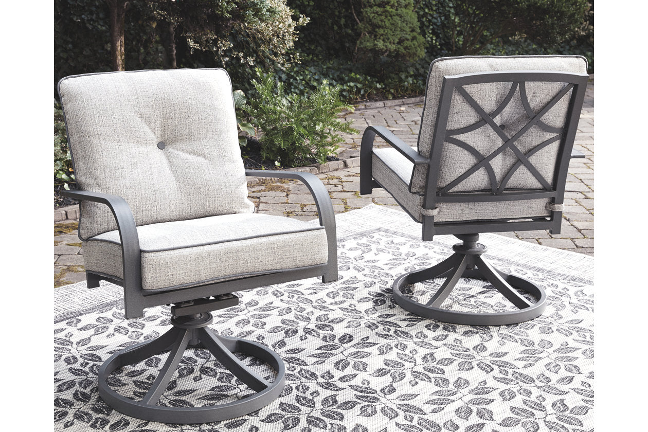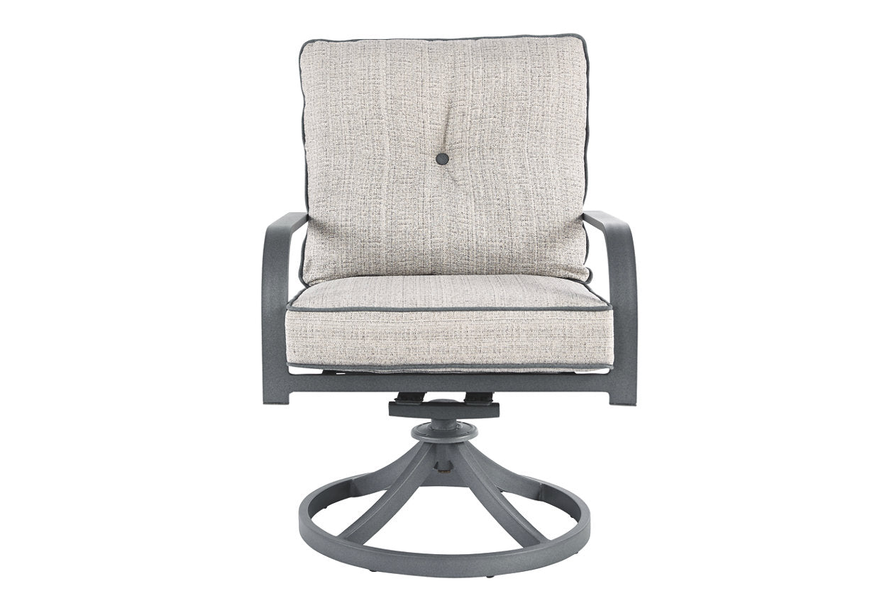 Sumptuously cushioned and richly styled, the Donnalee Bay outdoor swivel chair set takes an exciting turn with its trendy, textural gray finish that’s decidely modern. Made of sturdy, rust-proof aluminum, this pair of outdoor swivel chairs also includes weather-friendly cushions wrapped in high-performing Nuvella® fabric that’s as plush as it is practical.