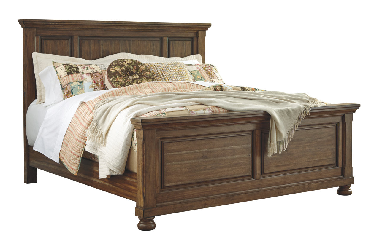 A fresh, new take on traditional style. The Flynnter queen panel bed meets today’s design tastes with beauty and grace. Tobacco brown finish allows the natural grain of the acacia veneers to show through in an organic way. Profiled crown moulding adds depth to the headboard and footboard. This is a look you can appreciate for years to come. Mattress and foundation/box spring available, sold separately.