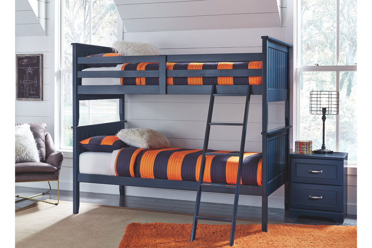 - Includes twin bunk bed panel headboards, footboards, roll slats, rails, ladder and 2 nightstands