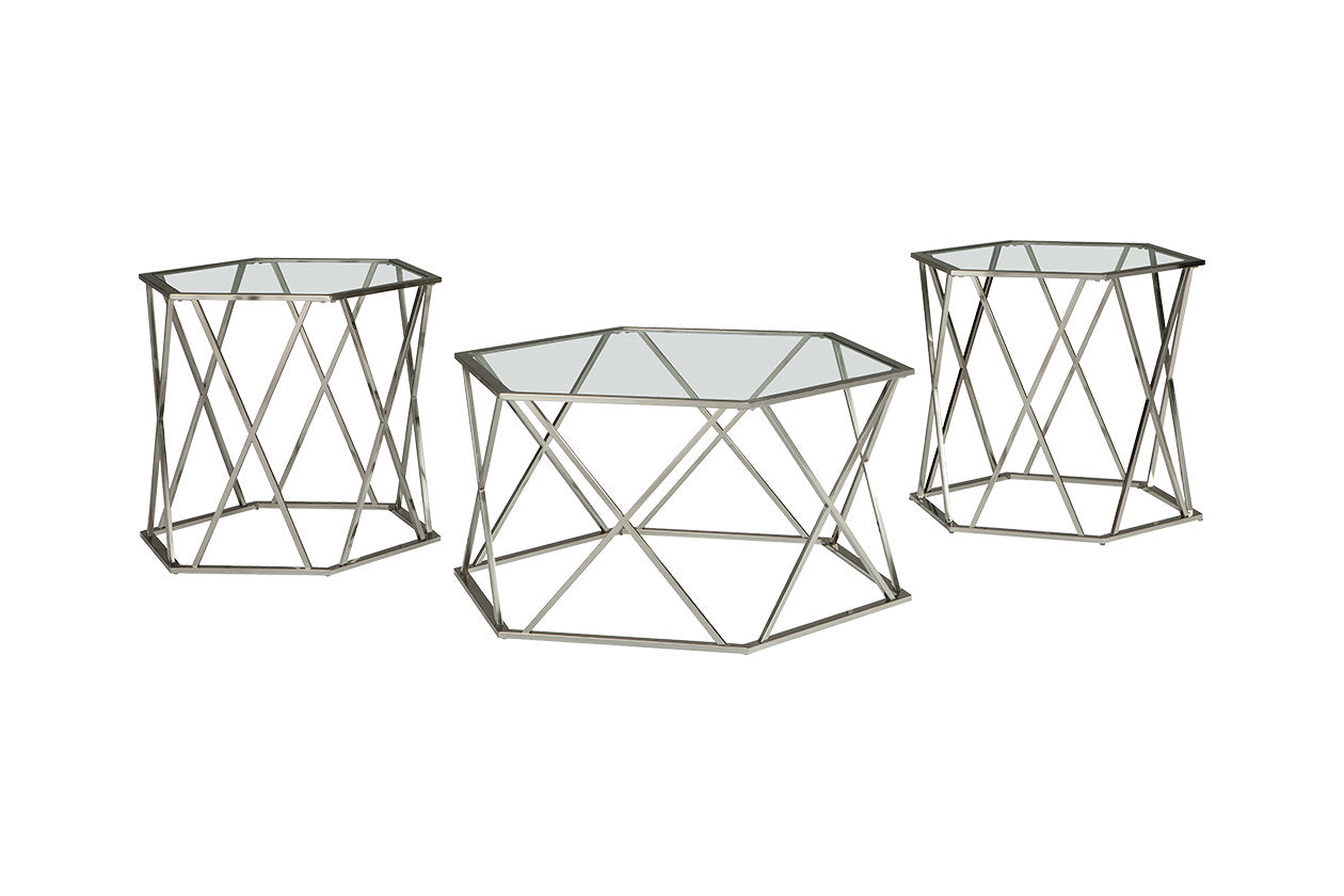 With its sculptural, hexagonal design, the Madanere coffee table set lets modern minimalism beautifully take shape. Chrome-tone metal merged with clear glass is sheer brilliance.