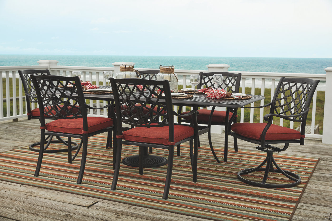 With the Tanglevale outdoor swivel rocker dining chair you're all set for elegant al fresco dining. Classic latticework creates a visual feast on the durably cast aluminum frame. High-performing Nuvella® seat cushion secures to the chair and stays bright through the changing seasons.