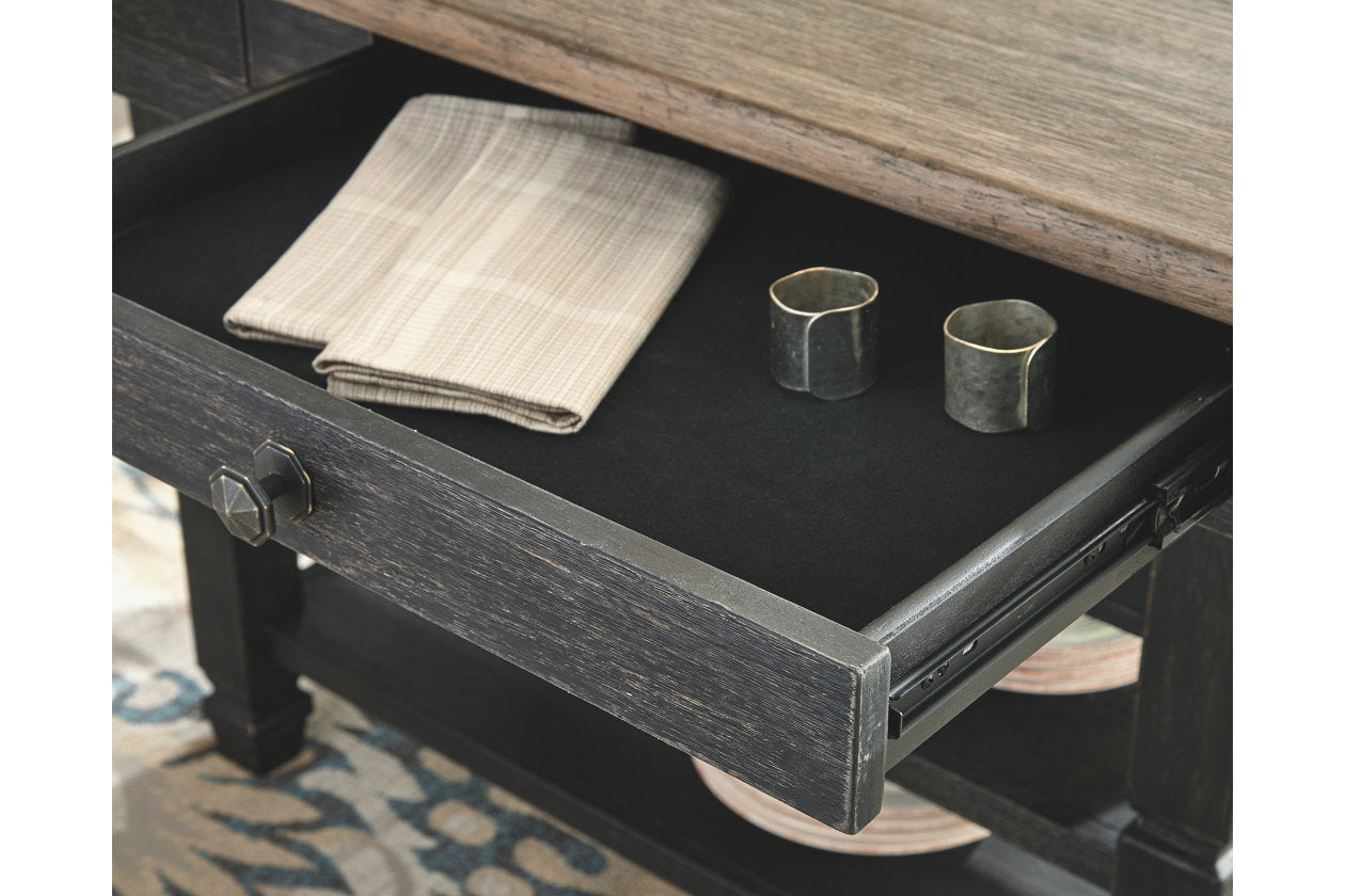 Invite your family into the heart of your home with the Tyler Creek rectangular dining table set. Tapered legs are a sturdy foundation, and the black finish is beautifully textured. Timeworn planked oak top on the table creates a unique two-tone contrast. Store away smaller items in the drawers. Heavily woven fabric on the chairs, paired with silvertone nailhead trim on the bench, has a quality feel-good touch. This is trend-right urban farmhouse style.
