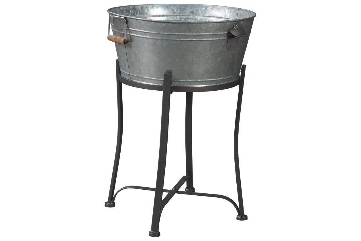 Sip your Sarsaparilla in style with the retro-chic Valrock beverage tub with stand. Its galvanized metal finish charms with yesteryear flair. Built-in bottle opener makes self-service a snap.